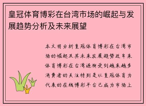 本文将分析皇冠体育博彩在台湾市场的崛起及其未来发展趋势。近年来,体育博彩在台湾逐渐受到越来越多消费者的关注,特别是以皇冠体育为代表的在线博彩平台,已成为市场上的重要力量。本文将从四个方面深入探讨皇冠体育博彩在台湾的市场崛起,包括其品牌优势、市场需求、监管环境以及未来发展前景。通过这些方面的分析,本文旨在展现皇冠体育博彩在台湾的成功经验和面临的挑战,并对其未来的发展进行预测与展望。