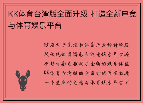 随着电子竞技和体育产业的持续发展,传统体育博彩和电竞娱乐平台逐渐趋于融合,推动了全新的娱乐体验。KK体育台湾版的全面升级,旨在打造一个全新的电竞与体育娱乐平台,不仅提升用户体验,还借助前沿技术,推动平台的发展。这篇文章将从多个角度深入探讨KK体育台湾版的全面升级,包括平台界面的优化、电竞项目的扩展、体育赛事的创新呈现以及用户互动体验的提升。每一个方面都体现出该平台如何通过技术和内容创新,满足现代用户的娱乐需求,构建多元化的娱乐生态。接下来,我们将详细分析这些升级措施,并展望未来发展趋势。