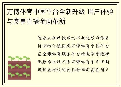随着互联网技术的不断进步和体育行业的飞速发展,万博体育中国平台在全球体育娱乐平台的竞争中逐渐脱颖而出。近年来,万博体育平台不断进行全方位的优化升级,尤其在用户体验和赛事直播功能方面,进行了全面革新。此次升级不仅提升了平台的整体性能,也为用户提供了更加丰富、流畅的体验。本文将从四个方面详细探讨万博体育中国平台全新升级带来的变化:用户界面的优化、赛事直播技术的提升、数据交互功能的增强以及个性化服务的创新。通过这些革新,万博体育中国平台为广大用户提供了更加便捷、高效和沉浸式的体育娱乐体验。